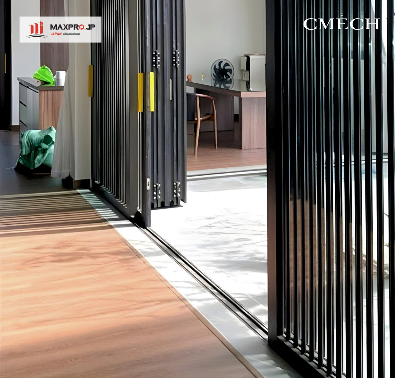 Đến gần hơn mới thấy cái “đáng yêu” của một hệ cửa làm kỹ: ray chạy thẳng, sàn phẳng gọn, cánh gấp mở ra nhẹ nhàng để không gian nối liền nhau. Những chi tiết nhỏ như tay nắm, nhịp gấp cánh, và cách cửa khép lại… tạo nên thứ trải nghiệm rất đời thường: đóng mở êm, nhìn gọn, và dùng nhiều vẫn thấy dễ chịu.