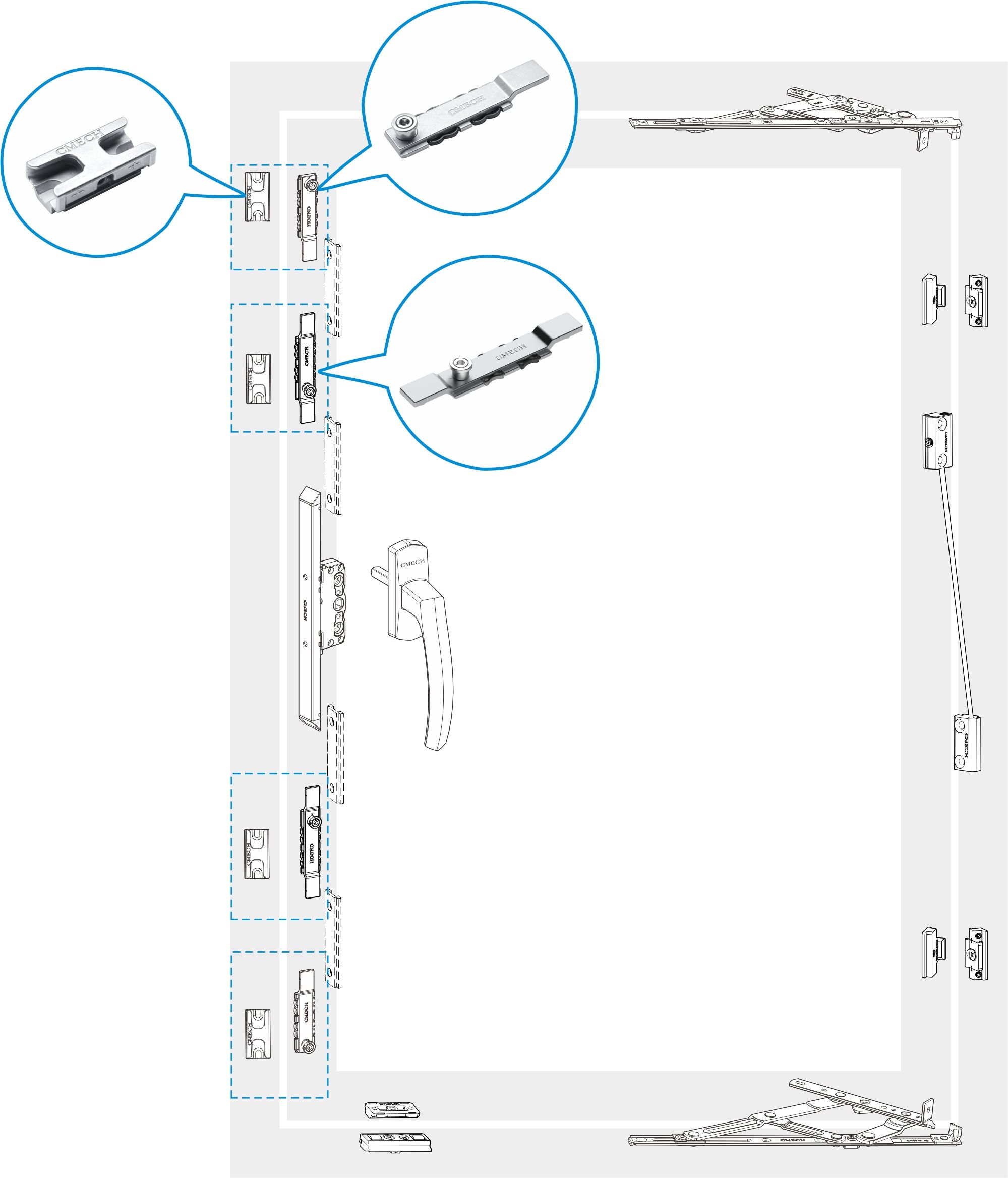 Khóa đa điểm bao gồm các điểm khóa, ghế khóa và thanh truyền động. Là cơ chế khóa giữa khung cửa sổ và khung cửa sổ, chốt khóa được lắp trên khung cửa sổ và điểm khóa được lắp trên khung cửa sổ, thường là ở phía mở của cửa sổ. Có các điểm khóa và ghế khóa phân bố xung quanh toàn bộ cửa sổ, được kết nối bằng thanh truyền, giúp cửa sổ được bịt kín và an toàn hơn.